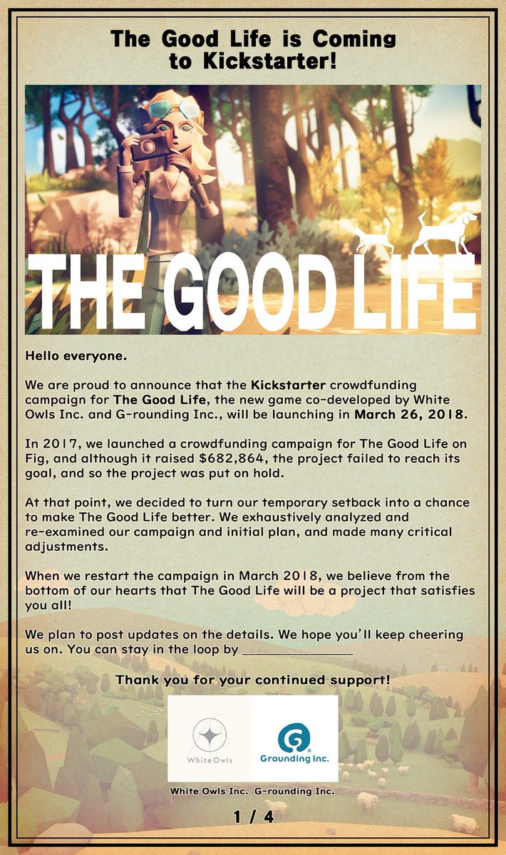 Revealed via a Fig mailer, White Owls plans to open Fig crowdfunding for the development of The Good Life on September 2 at 7:00 p.m. PT (right after Suehiro’s PAX West 2017 panel).