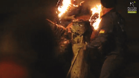 During the event, a bull is forcibly tied to a post as lumps of flammable tar are spread on its horns. The tar is then set on fire and the terrified animal released, thrashing around the square while spectators cheer and blow horns. Afterwards the bull is taken to a slaughterhouse and killed.